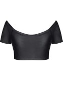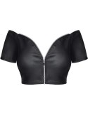 Top z ozdobnym ekspresem z przodu, wykonany z czarnej, elastycznej ekoskóry. Głęboki dekolt i odkryte ramiona.