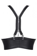 Krótki top z profilowanymi miseczkami. Z przodu zwraca uwagę atrakcyjny dekolt oraz srebrny ozdobny ekspres. Szelki będące w zestawie są odpinane. Wyróżnia je oryginalny pomysł i wygląd. Są zrobione z ozdobnych zapinek oraz ekspresu, który także jest ozdobny oraz służy do regulacji długości szelek.Top w całości został wykonany z czarnej, elastycznej ekoskóry z fakturą prawdziwej skóry. Jest miły w dotyku i wspaniale dopasowuje się do ciała.Doskonale pasuje m.in. do spodni BRMaddalena001 - widocznych na zdjęciach.Kolor: czarnyRozmiary: S,M,L,XL,XXLSkład surowcowy: 95% poliester / 5% elastan