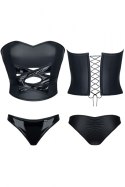 W komplecie:GorsetPantyKomplet Halia, efektowny, seksowny i tchnący wyraziście nacechowaną erotyzmem elegancją.Gorset z elastycznej eko skóry doskonale dopasowuje się do ciała. Z przodu przykuwa uwagę efektownie podkreślony dekolt oraz znajdująca się pod biustem, ciekawa wizualnie kompozycja z lakierowanego, błyszczącego materiału. Z tyłu wyróżnia się efektownym pionowym sznurowaniem.W skład kompletu Halia wchodzą także panty, stanowiące uzupełnienie gorsetu. Z przodu wykonane z czarnego, metalicznie błyszczącego materiału, z tyłu z czarnej eko skóry.Cechy charakterystyczne:1. Wzmacniające przeszycia w newralgicznych miejscach2. Materiał elastyczny i sprężysty3. Materiał miły w dotyku4. Sznurowanie z możliwością regulacji i modyfikacji Kolor bielizny: czarnyDostępne rozmiary bielizny: S,M,L,XL,XXLSkład bielizna: PVC: 100% polyester // ekoskóra: 95% polyester, 5% elastan