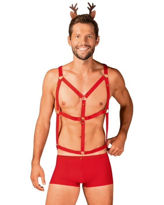 Figlarny Pan Renifer nabrał ochoty na zabawę! Pikantna, czerwona uprząż i kuszące bokserki to bardzo seksowny i zmysłowy komplet, gotowy na psoty w sypialni. Niezwykle uroczym elementem jest opaska z uszami renifera, która doskonale uzupełni całość stylizacji. Poznaj więcej szczegółów:- zabawny komplet: uprząż, bokserki i urocze uszy renifera- uprząż z możliwością regulacji - komfort i wygoda noszenia- męskie bokserki z elastycznej siateczki - podkreślone pośladki- seksowne wycięcie na tyle - intryguje i kusi- błyszczące elementy - dodają uroku- opaska z uszami renifera - frywolny dodatek- miłe w dotyku materiały (bokserki: 94% poliamid, 6% elastan, uprząż: 90% poliamid, 10% elastan, opaska: 45% PU, 5% iron metal, 45% PP plastik, 5% poliester)