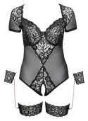 Delicate lace in a captivating look! Crotchless body from Cottelli BONDAGE made out of stretchy powernet with delicate lace inserts. With short sleeves and rhinestone decoration between the underwired cups. There is a hook fastener at the back. The briefs part is crotchless. The front of the briefs are made out of lace and the back part is made entirely out of powernet. Includes lace handcuffs and thigh cuffs which are joined to each other by rose-gold coloured chains (with snap hooks). 90% polyamide, 10% spandex.