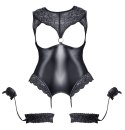 Pure seduction - including garters with handcuffs!Crotchless high-neck body in matte look. It has open cups and has beautiful, delicate floral lace in the cleavage area and at the back. A silver-coloured decorative ring at the front and lace around the legs complete the erotic ensemble. The open crotch is sensually highlighted by stretchy straps. Includes 2 garters that have lace handcuffs sewn onto them.90% polyester, 10% spandex; lace 90% polyamide, 10% spandex.