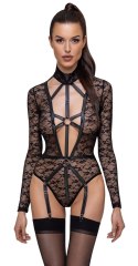 Delicate lace in a provocative style!The rio body with long sleeves from Cottelli LINGERIE is made entirely out of soft, delicate lace and has fancy matte look details. It is tight-fitting but also stretchy and soft which means that it is very comfortable. It has a low-cut neckline at the front and is open right to the belly button. The front has a provocative harness look with stretchy straps and rings. The body has a very low-cut back as well that is only held together by decorative stretchy straps. The lace collar is closed with 2 buttons at the back of the neck. There are press studs over the crotch. The suspender straps are adjustable and can be removed completely. 90% polyamide, 10% spandex.
