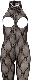 Elegancki bodystocking z seksownymi otworami na piersi oraz prowokującym rozcięciem z przodu. Wykonany z elastycznej i miękkiej tkaniny w piękne wzory z motywem kokardek. Pod szyją ozdobny, koronkowy kołnierzyk. Wyjątkowa propozycja na specjalne okazje. Efekt zniewalający! Dzięki elastycznemu materiałowi kombinezon idealnie układa się na ciele, podkreślając kobiece piękno.