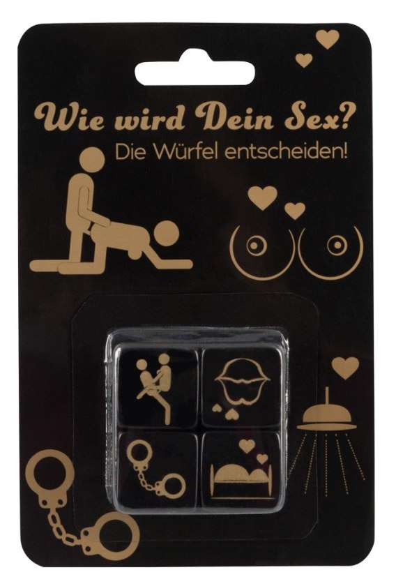Let the dice decide how you have sex! Don't you know how or where you should do IT?Let these dice decide - one roll of the dice is enough! A set of 4 black dice (25 x 25 x 25 mm) with gold-coloured pictures on them. The pictures are of a "position", a "place", an "accessory" and a "body part". Material: acrylic.