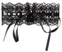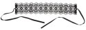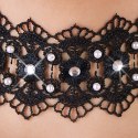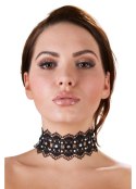 Czarny haftowany naszyjnik ozdobiony białymi perłami i cyrkoniami. Z tyłu jest satynowa wstążka.