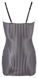Obcisła mini sukienka z regulowanymi ramiączkami i dwoma szelkami z przodu. Z przodu zapinana na guziki, przy głębokim dekolcie wskazany kołnierzyk. W tym krawat do krawata.