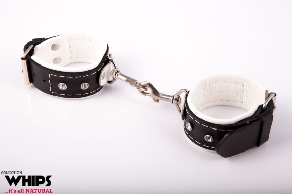 WHIPS Skórzane kajdanki damskieSkórzane kajdanki w kolorze biało-czarnym zapinane na masywne klamry. Możliwość regulacji rozmiaru.Produkt został wykonany bardzo starannie z naturalnej skóry bydlęcej. Skóra ta wyprawiana jest metodą tradycyjną, garbnikami roślinnymi w najstarszej czynnej w Polsce garbarni. Skóra ta jest bardzo mocna, a jednocześnie delikatna w dotyku, a ponadto charakteryzuje się ekscytującym zapachem. Posiada unikatową cechę dostosowywania się do kształtu ciała i z biegiem czasu nabiera szlachetności. Produkt bardzo dobry gatunkowo.Wyprodukowano w PolsceOpakowanie: eleganckie czarne pudełko