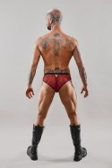 Brazilian type briefs. Entirely made of elastic and stretchy tulle in the black and red zebra color. At the waist, black, wide and nice to touch elastic band. In the front under the tulle an insert of black glossy vinyl. Makes the effect of optical enlargement and a spectacular look.