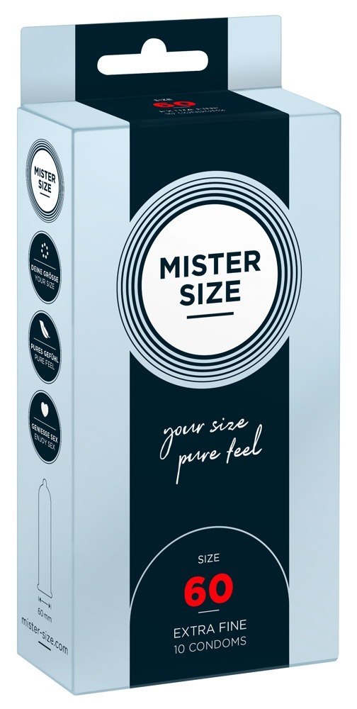 Przezroczyste, niezwykle cienkie prezerwatywy wykonane z naturalnego lateksu. Prezerwatywy są pokryte lubrykantem i zakończone smoczkiem. Wegańskie. Mężczyzna/kobieta może wybrać odpowiedni rozmiar prezerwatywy dla penisa, korzystając z przodu opakowania, ponieważ na środku znajduje się szeroka, ciemnoniebieska skala pomiarowa.