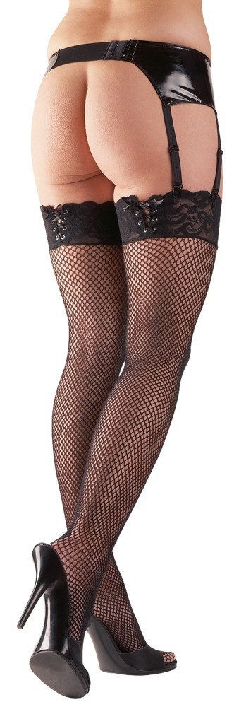 Pończochy wykonane z delikatnego materiału siateczkowego dla pięknych nóg. Klasyczne koronkowe górne części podkreślone są ozdobnym sznurowaniem z tyłu. Prawdziwy must-have dla wszystkich fashionistek.