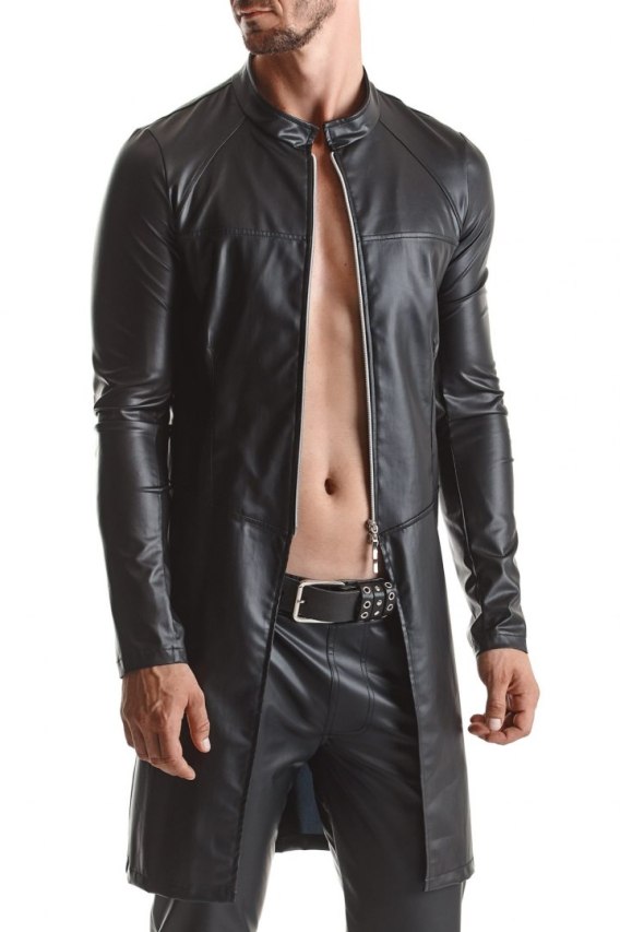 Efektowny płaszcz zdecydowanie wyróżniający się kształtem oraz licznymi rozwiązaniami konstrukcyjnymi, przygotowanymi w celu idealnego podkreślenia sylwetki i proporcji ciała. Wykonany z czarnego wysokiej klasy wetlook’a. Jest miły w dotyku i elastyczny, a w przypadku tego modelu to ważne, gdyż po zapięciu dokładnie przylega do ciała. Z przodu poziome i skośne przeszycia wyglądają same w sobie oryginalnie, ale jedocześnie wzmacniają efekt ekspozycji klatki piersiowej i linii pasa. Podobnie na plecach - w górnej części skośne przeszycia optycznie poszerzają plecy i wyglądają unikalnie. Z przodu dopasowanie produktu ułatwia srebrny ekspres. Jest także elementem ozdobnym i przyjemnym do różnego typu zabaw, gdyż można go odpinać z góry i z dołu. Czerwone przeszycia i czerwona metka z Alcantary to już cudownie dopracowane detale. Płaszcz RMMario001 doskonale nadaje się zarówno na wyrafinowane imprezy fetyszowe jak i do codziennych stylizacji.