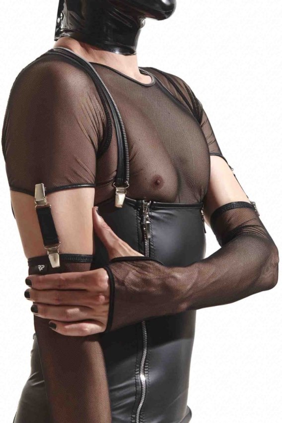 Długie rękawiczki wykonane z czarnej, elastycznej siateczki. Sięgające od połowy dłoni za łokieć. Dodatkowe wycięcie na kciuk. Świetnie dopasowują się do dłoni i przedramion, podkreślając i ukazując ich kształt. Dodatkowo w zestawie są elastyczne paski ze srebrnymi, metalowymi zapięciami. Służą do przypinania rękawiczek do koszulki - dzięki czemu rękawiczki nie zsuwają się i efektownie się prezentują. Zapięcia pasków są trwałe, metalowe i wodoodporne. Produkt sprzedawany w pudełku z logo RFP - bez spersonalizowanego zdjęcia.