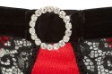 Fancy in every detail!Sensual satin bustier with a slightly padded shelf bra, adjustable strap details and an adjustable collar. With semi-transparent lace inserts and decorative lacing below the breasts, complemented by a rhinestone ring further below. The matching waist-high crotchless briefs have adjustable and removable suspender straps. Around the hips it is held together by 3 stretchy straps. With another rhinestone ring on the waistband and semi-transparent lace inserts at the front and back.90% polyamide, 10% spandex.