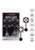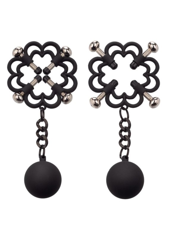Power Grip 4-Point Weighted Nipple Press. Explore elevated sensation with the 2 fully adjustable multi use clamps, screw down 4-point press, and teasing weights.Reach new levels of playful pleasure in the screw-down 4-point press with fully adjustable screws covered in a power grip Silicone-cote. Clamp the naughty clasps to the nipple or anywhere on the body and enjoy every rush of pain and pleasure with every tug or swing of the weights. The teasing clamp has fully adjustable 4 points of tension to stimulate anywhere on your body for playful teasing. As the tension tightens, the tingles intensify with every turn of the screw for the ultimate in nipple stimulation toys. These easy-to-use nipple teasers are great for him, her, or them.