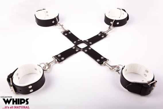 Skórzany krzyżak do krępowania rąk i nóg. Kajdanki w kolorze biało-czarnym, szerokość regulowana za pomocą masywnych klamerek.Materiał: naturalna skóra + części metalowe.Szerokość: 4 cm.Wymiary: nadgarstki 20-24cm,Wymiary: nogi 24-28cmProdukt został wykonany bardzo starannie z naturalnej skóry bydlęcej. Skóra ta wyprawiana jest metodą tradycyjną, garbnikami roślinnymi w najstarszej czynnej w Polsce garbarni. Skóra ta jest bardzo mocna, a jednocześnie delikatna w dotyku, a ponadto charakteryzuje si ę ekscytującym zapachem. Posiada unikatową cechę dostosowywania się do kształtu ciała i z biegiem czasu nabiera szlachetności. Produkt bardzo dobry gatunkowo.Opakowanie: eleganckie czarne pudełko.
